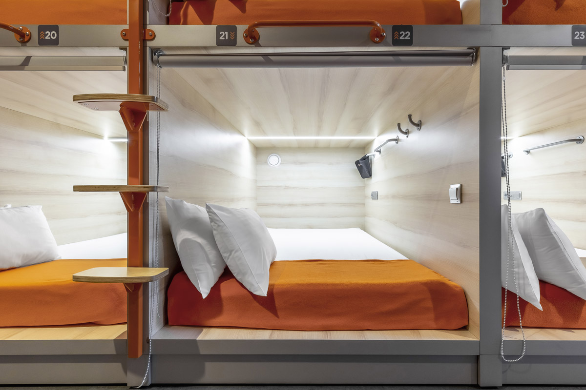 Features: High-tech sleeping pods, a rooftop lounge, a trendy bar, and smart security features.